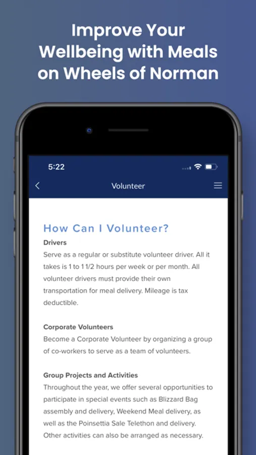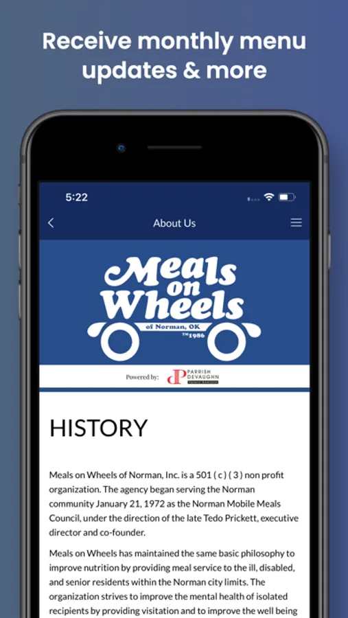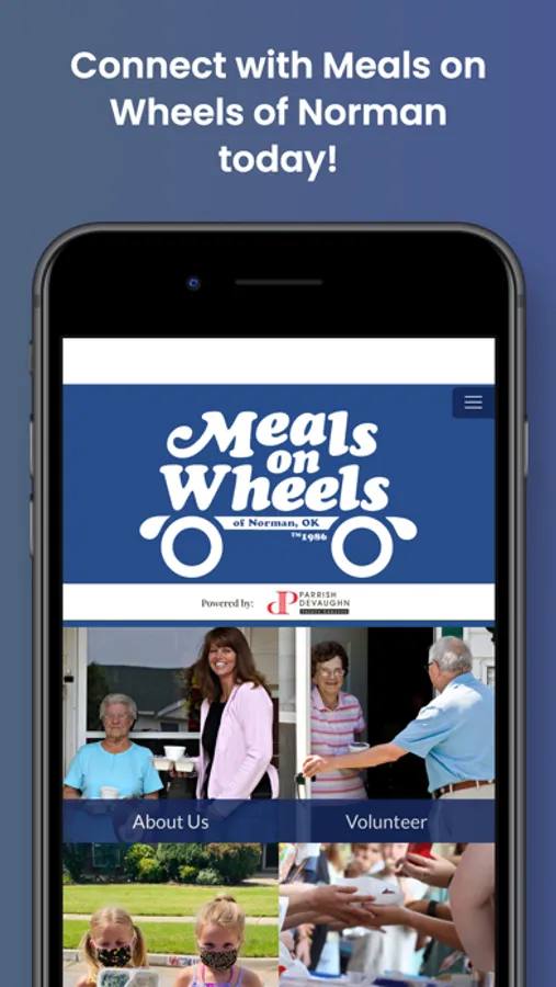 We invite you to download our FREE app to get connected with Meals on Wheels of Norman and stay informed through push notifications regarding meal delivery and important news within the organization. The app will feature the monthly menu and allow you to interact with the office staff to communicate important information and menu additions and cancellations.