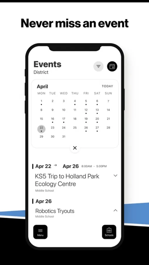 The event section shows a list of events throughout the district. Users can add an event to their calendar to share the event with friends and family with one tap.