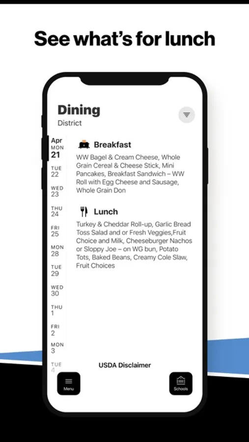 Within the dining section, you'll find an easy to navigate, weekly menu, sorted by day and meal type.