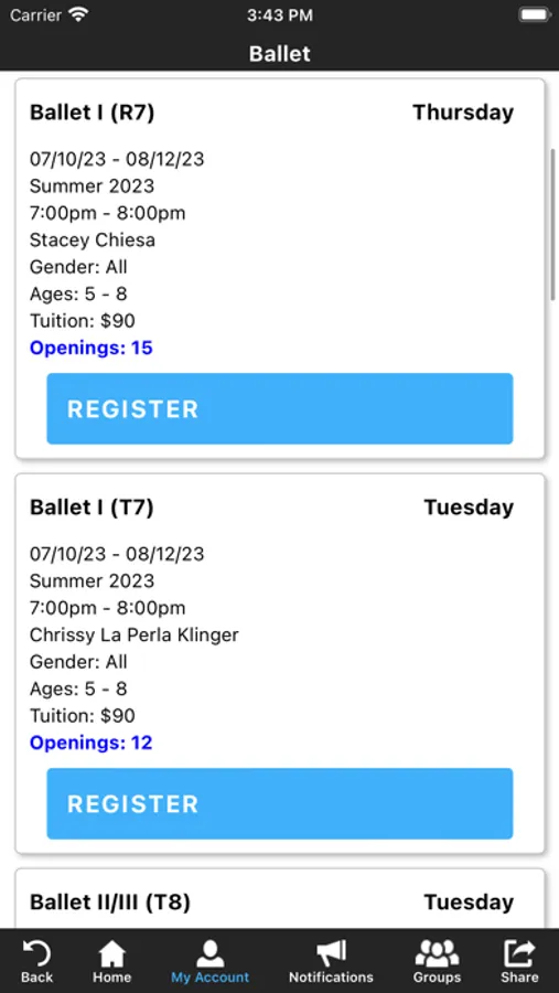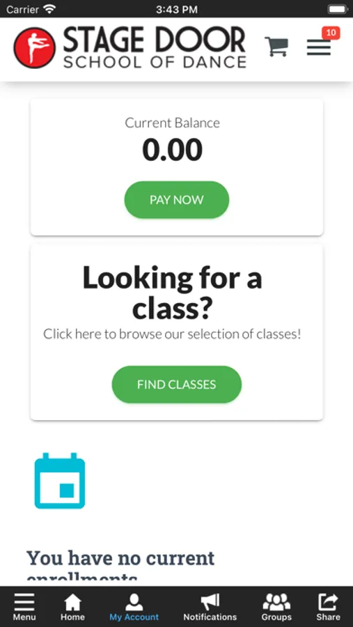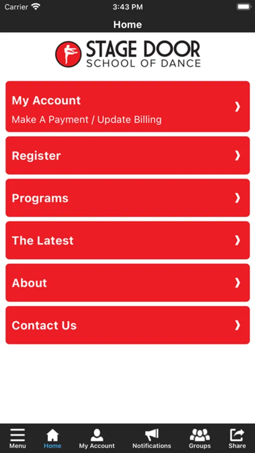 The Stage Door School of Dance app allows you to manage your MYSDSD account with ease, register for classes, private lessons, and events. You'll also receive important notifications about class changes, closings, registration openings, special announcements, and upcoming events.