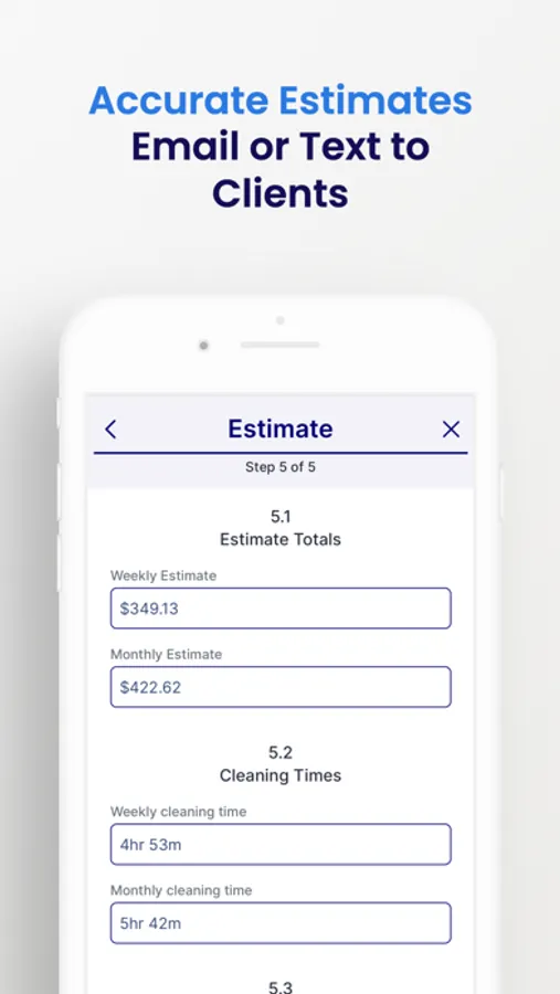 Accurate Estimates: Generate precise and professional quotes for new clients in minutes. Our advanced algorithm considers factors like house size, cleaning frequency, and special requirements to provide you with a customized estimate that your clients will appreciate.