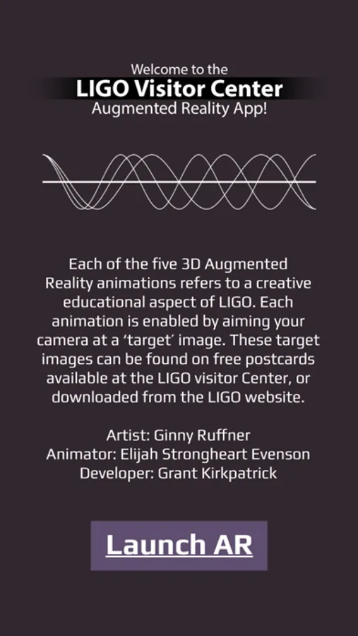 This app is a companion to the LIGO visitor center. Visitors can download this app to activate a variety of provided postcards to learn more about how our Laser Interferometer works and to view artistic interpretations of the scientific work we do.