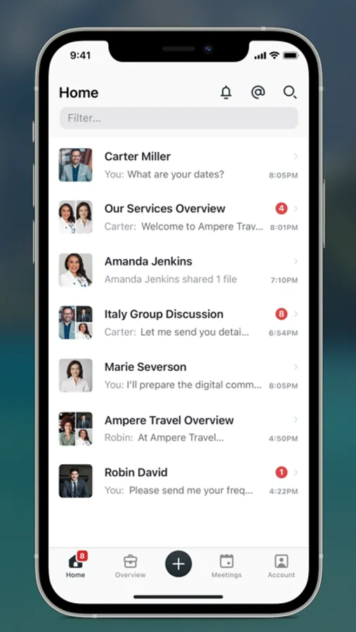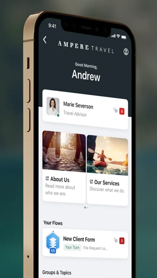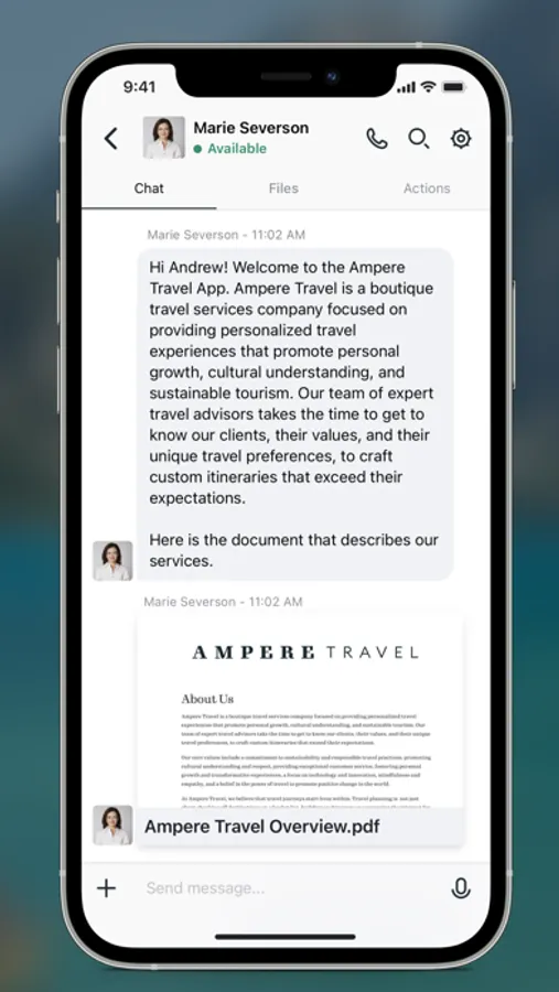 For travel professionals, our app provides a one-stop shop for managing and streamlining the chaos of navigating different chat/phone/video apps, texts, emails, file sharing, forms, signatures, and approvals. Our app combines all of these capabilities into a single platform, making it easy to interact for a more efficient experience — giving you more time to plan more travel!