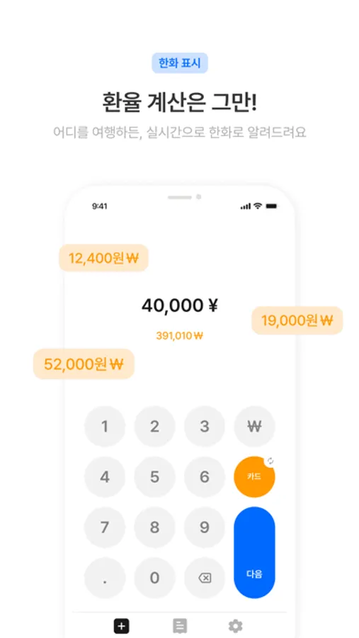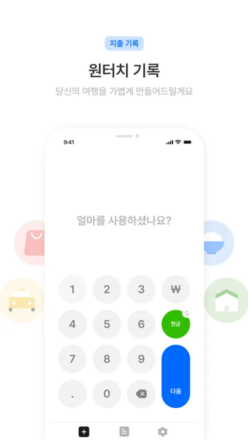간단하고 빠른 지출 기록을 통해, 여행 중에도 복잡한 메모나 계산은 신경쓰지 마세요. 한 번의 탭으로 지출이 기록되고, 한 번의 스와이프로 내역을 확인할 수 있어요.