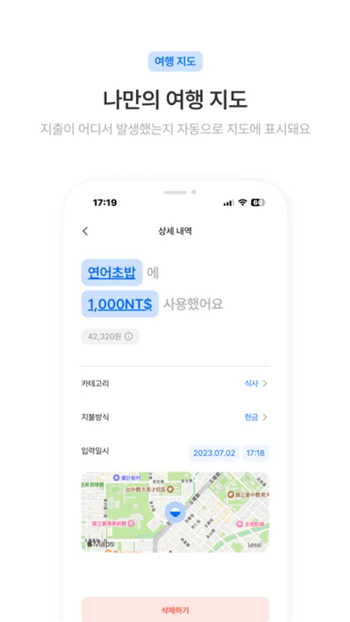 지출이 어디서 발생했는지 자동으로 지도에 표시돼요. 여행이라는 소중한 추억을 간직해보세요.