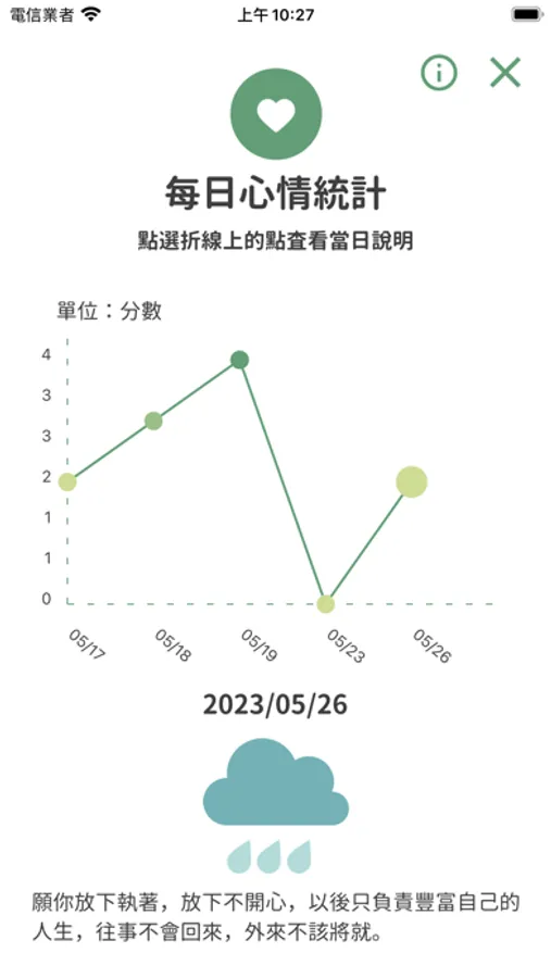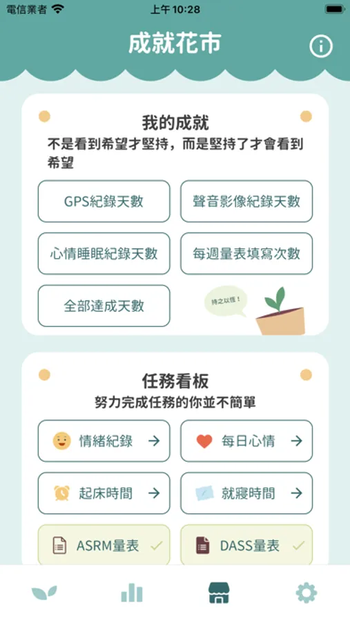 記錄自己的每日情緒、睡眠時間與活動量資訊(GPS)。我們會將您收集的資料整理成圖表供您自我檢視過去兩週的狀況。