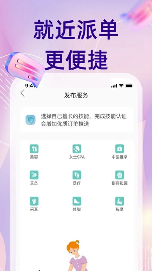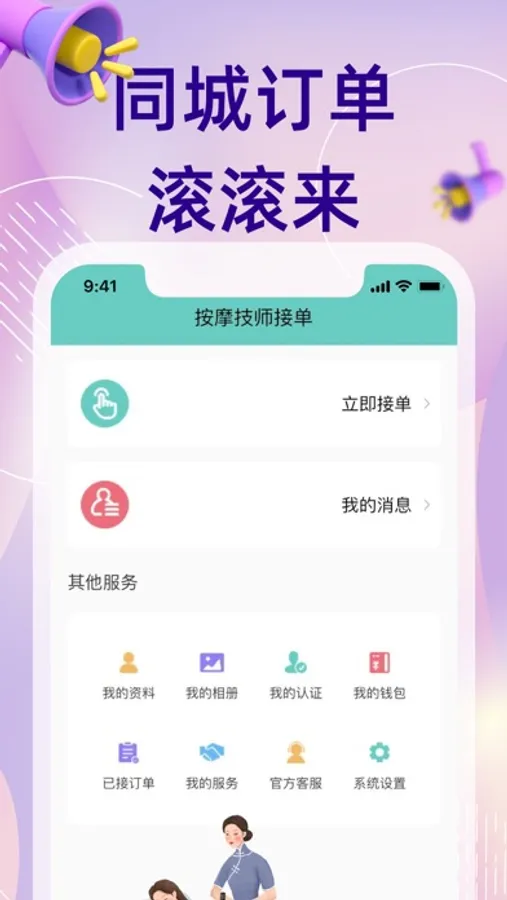 本平台是按摩技师自主接单工具,技师注册成功后,可以随时随地接单,效率,灵活,更效率。