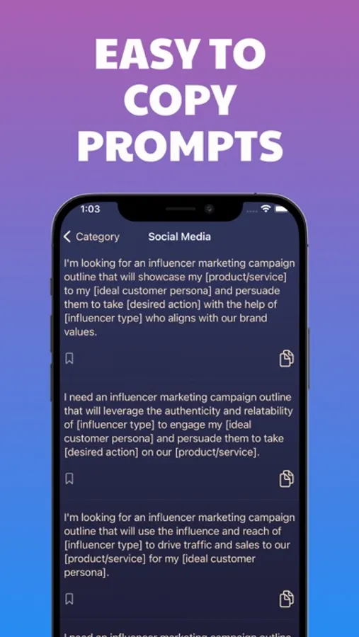 Easy copying: Our application offers a simple and intuitive interface. With just one touch, you can easily copy the selected prompt or code snippet for quick integration into your projects.