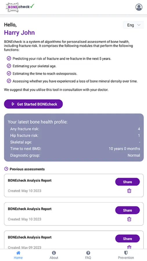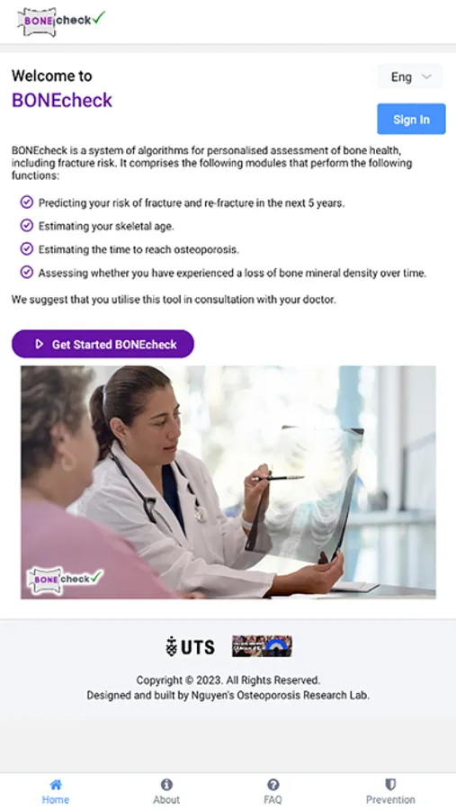 The results produced by BONEcheck should serve as a guide only and are not intended to substitute for professional advice. The interpretation of results should be done by appropriate scientific and/or clinical training individuals. If concerned about your fracture risk, it is important to consult your doctor or a bone specialist. BONEcheck is designed and built by Nguyen's Osteoporosis Research Lab, as a result of our publications, please find more information about our research via our website.