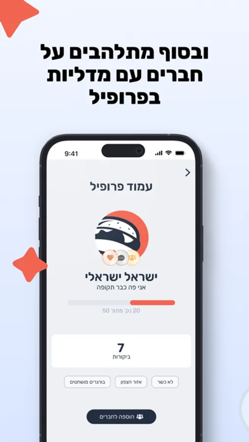 לכל אחד ואחת מכם, יש את האפשרות לקבל מדליות שמוכיחות את האהבה שלכם להמבורגרים. את המדליות משתמשים אחרים יוכלו לראות והן יעידו על הפעילות שלכם באפליקציה ועל איכות הביקורות שאתם מעלים.