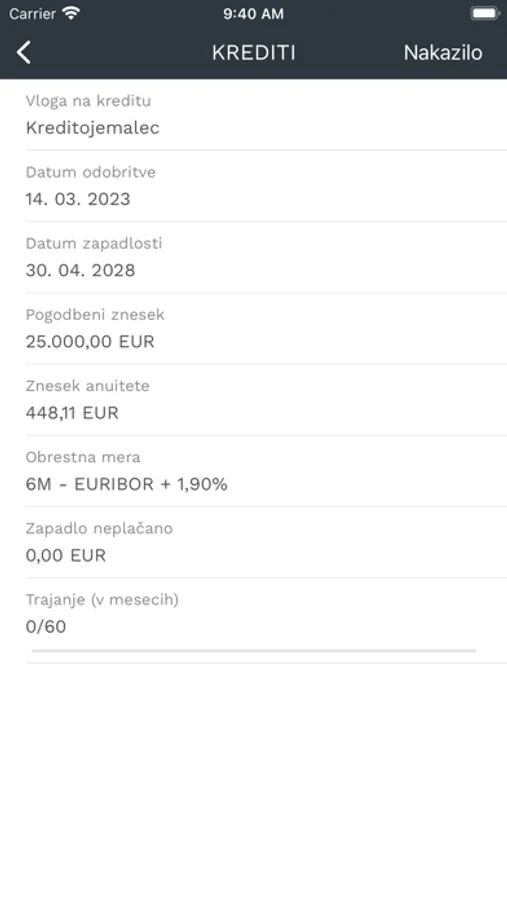 • pregled podatkov o sklenjenih kreditih (stanje, trajanje in grafični prikaz trajanja, znesek zapadlih neplačanih obveznosti) in možnost hitrega plačila obroka;