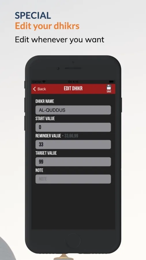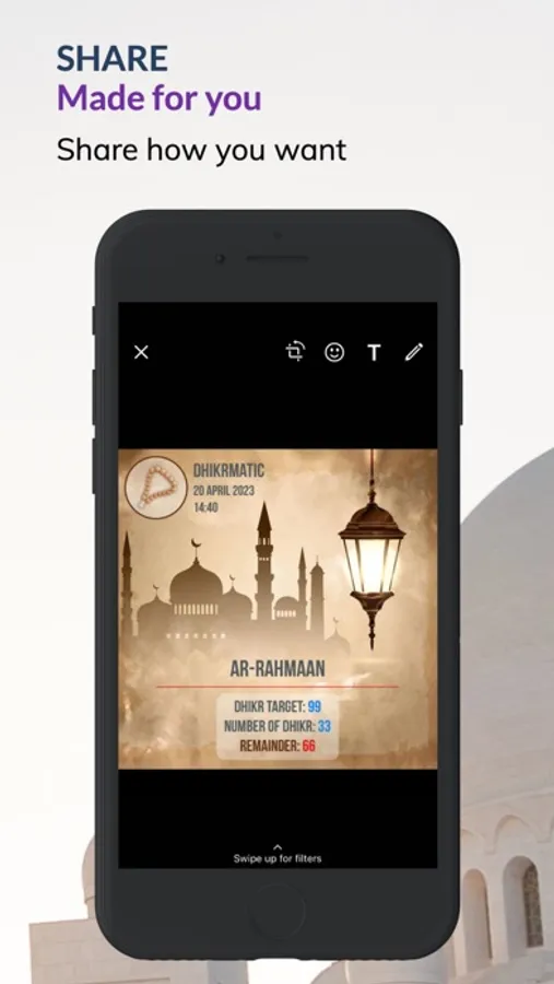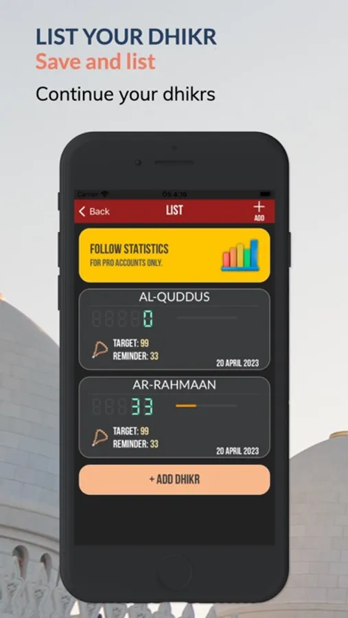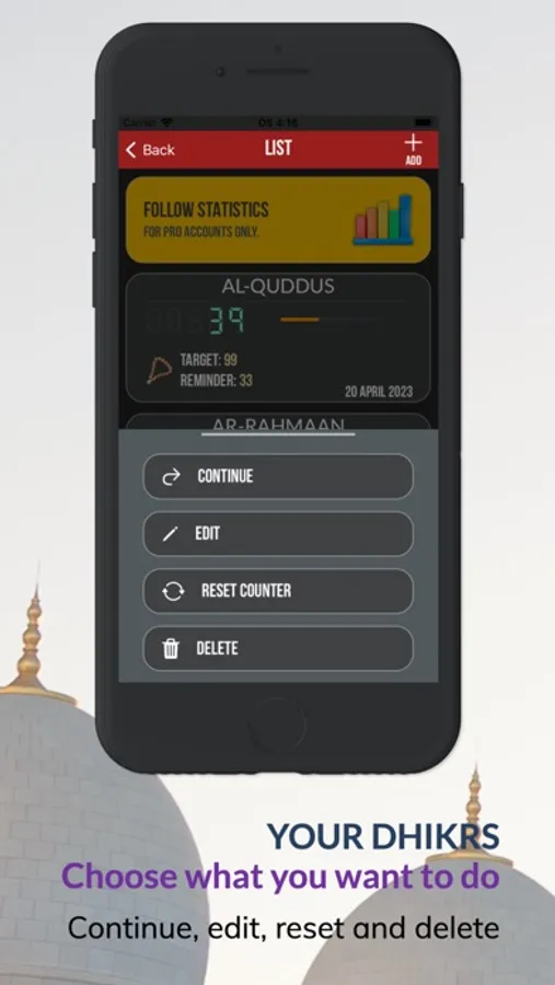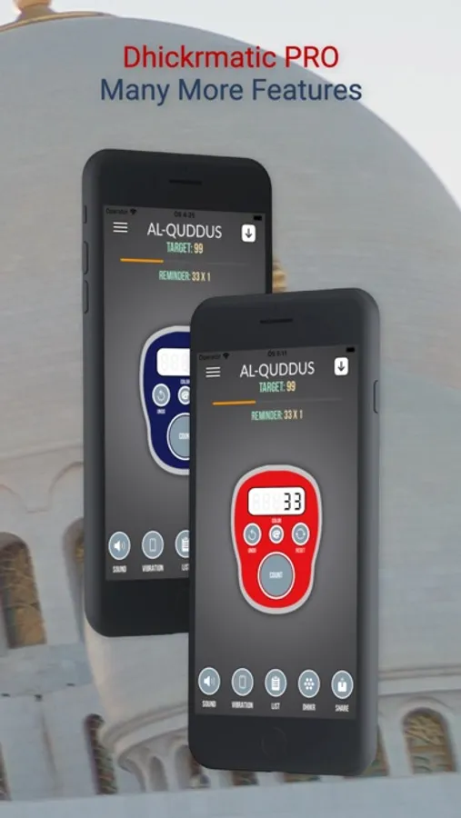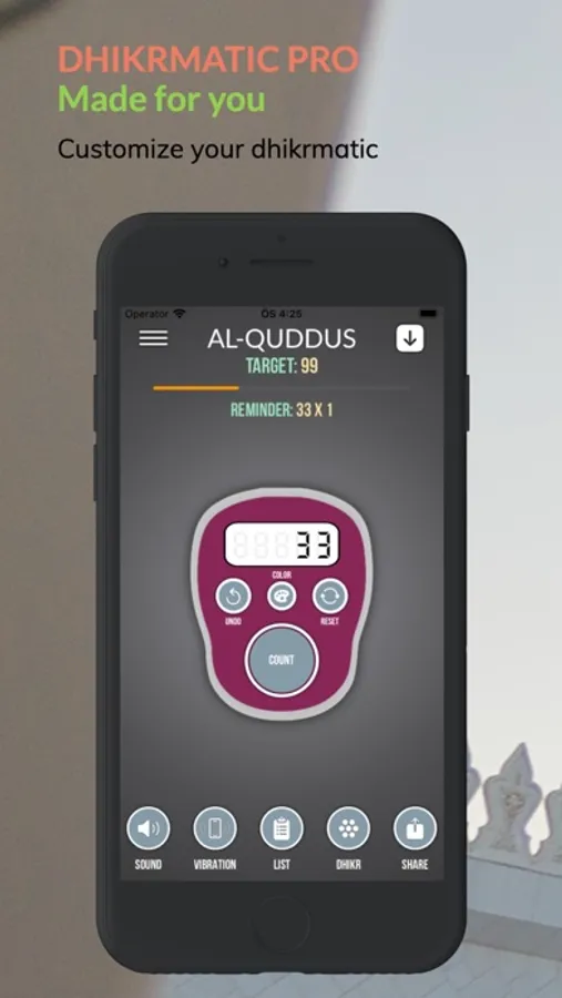 Dhikrmatic Pro has been published as an advanced version of rosary applications. With Dhikrmatic Pro, you can easily make and share your tasbihat anywhere over the phone. With the Dhikrmatic application, you can record your dhikrs and continue the dhikrs previously recorded from where you left off. You can customize your dhikr in the colors you want, and you can also change the background color. It can be recorded as dhikr name, dhikr number, dhikr target, stop value and note. It can be sorted in the record list. It can also be shared. Even if the rosary application is closed and reopened, the dhikr counter continues from the last value left. The dhikr counter is cleared only when the "Reset" button is touched.