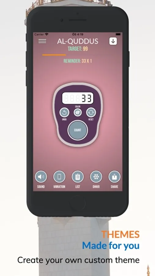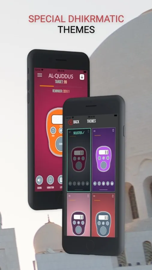 You can continue to chant without looking at the screen thanks to vibration or audible warnings during dhikr, if you wish, you can turn off the voice alerts and vibration. The Rosary interface is designed to be fully customizable thanks to themes in different colors. Tasbih Counter supports Turkish (Zikirmatik), English (Tasbeeh), Indonesian (Tasbih), Arabic (المسبحة, مِسْبَحَة, سُبْحَة, تَسْبِيح), Russian (тасбих), Malay, French and German languages.