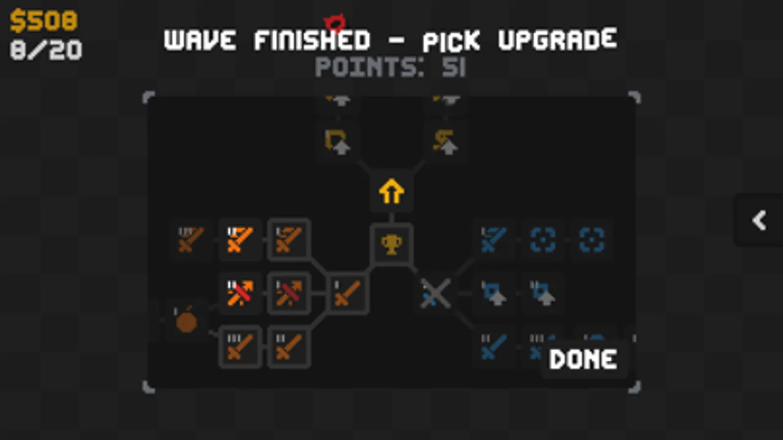 After finishing a wave, you may pick an upgrade to buff your turrets, choose wisely! Going for the Shooter path blocks you from following the Arcane one.