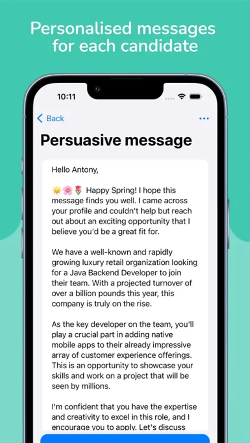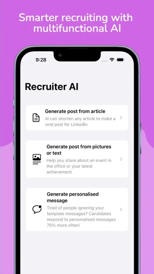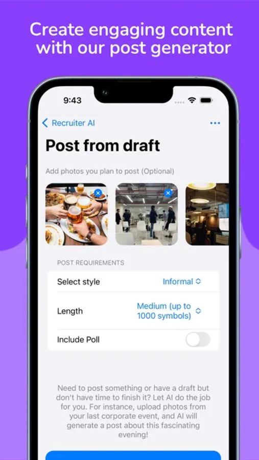 But that's not all! Recruiter AI also allows you to generate personalized LinkedIn posts based on photos and requirements, making it easier than ever to attract top talent to your organization. With our powerful AI technology, you can create messages that speak directly to each candidate's skills and interests, increasing the chances of a successful hire.