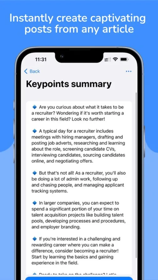 With Recruiter AI, you can easily and quickly summarize any article and turn it into an engaging post that will increase your company's online visibility. Our advanced algorithms analyze the content and extract the most relevant information to create a post that will catch the eye of potential candidates and clients alike.