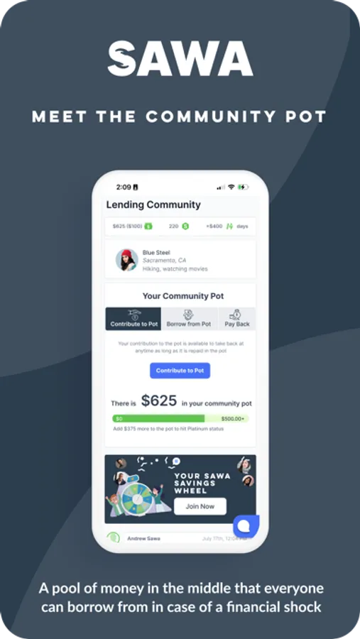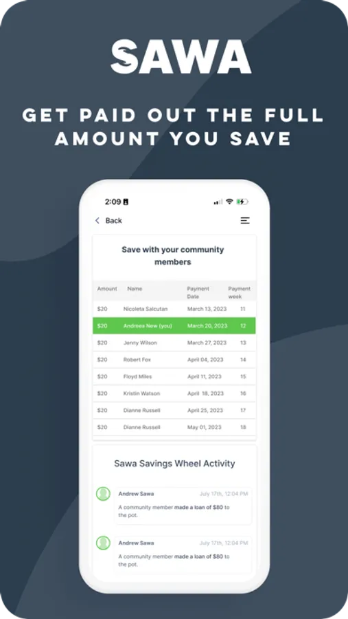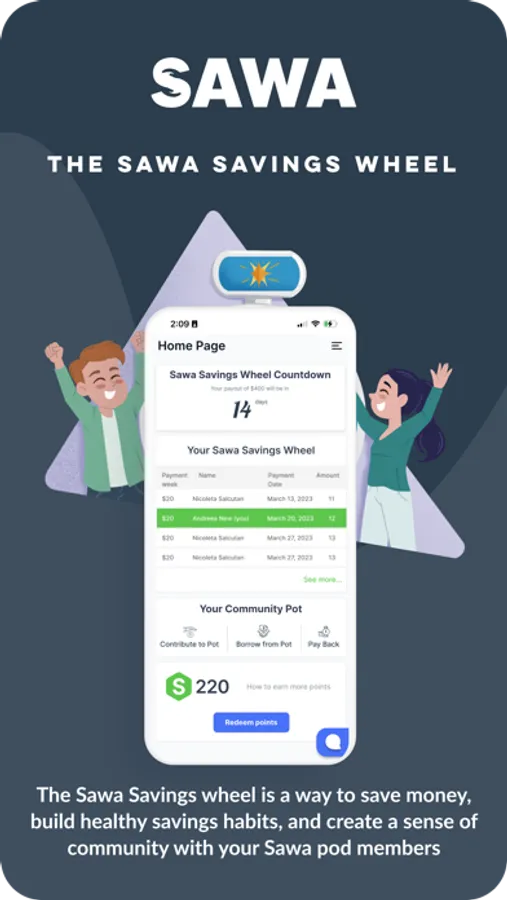 The Sawa Savings Wheel is a fun and interactive way to save money, build healthy savings habits, and create a sense of community with your Sawa pod members. Each week, you save a small amount of money with your community members, and when it's your turn on the wheel, you receive a lump sum payout of the total amount saved. Each member of the wheel gets paid out the full amount of what they have saved on a rotating basis, which encourages everyone to save more money. Join the Sawa Savings Wheel today and find that saving money is easier when done with your community members.