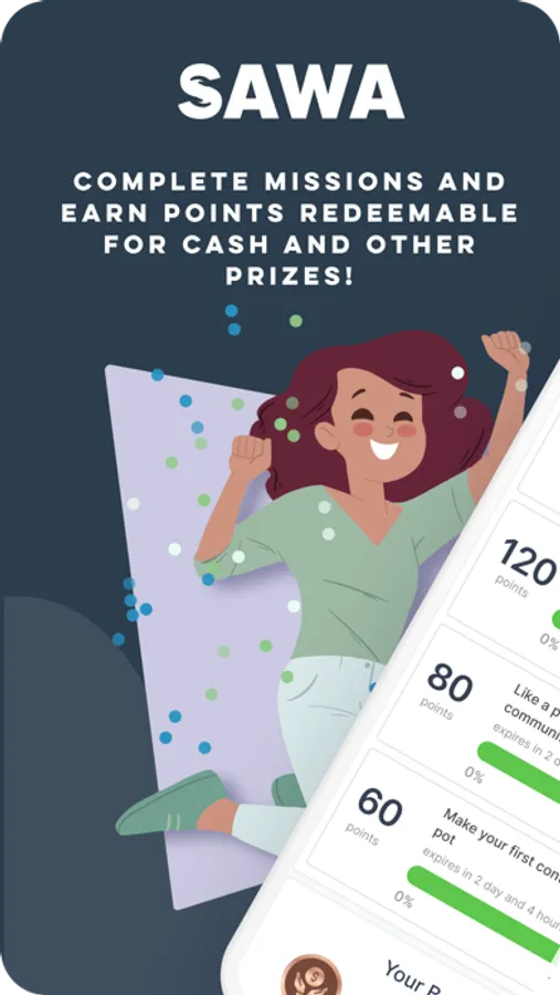 Sawa Missions allows you to earn points by taking action on the app. These points can be redeemed for cash, gift cards, or entries into the Sawa Sweepstakes.