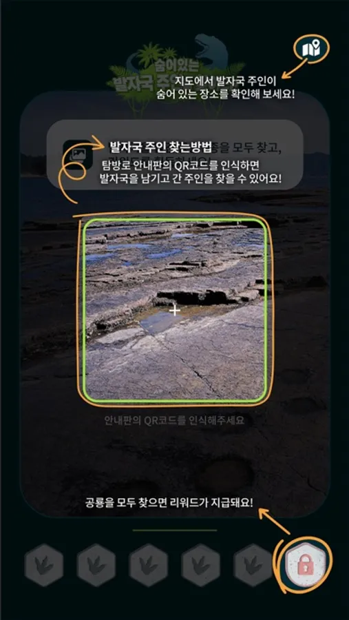 실제 공룡 발자국 화석 산지인 고성 상족암 일대에서 생생한 증강현실이 펼쳐집니다. 안내판에 부착된 QR코드를 이용하여 증강현실로 구현된 공룡과 공룡에 대한 재미있고 유익한 자료들을 만날 수 있습니다. 상족암 일대에 발자국을 남긴 공룡 5종을 모두 찾고 리워드를 획득하세요.