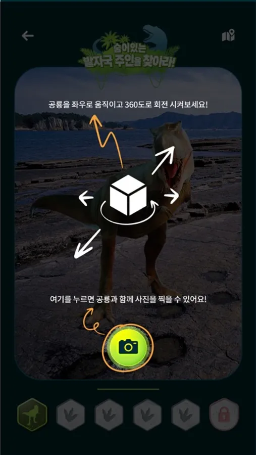 실제 공룡 발자국 화석 산지에서 즐기는 증강현실 애플리케이션. 공룡 발자국 화석과 함께 증강현실로 나타나는 공룡을 만나보세요.