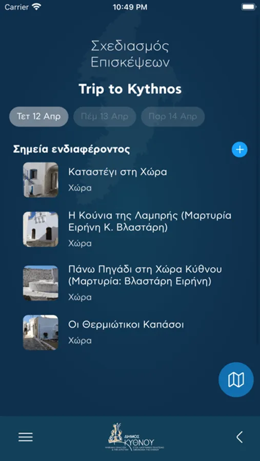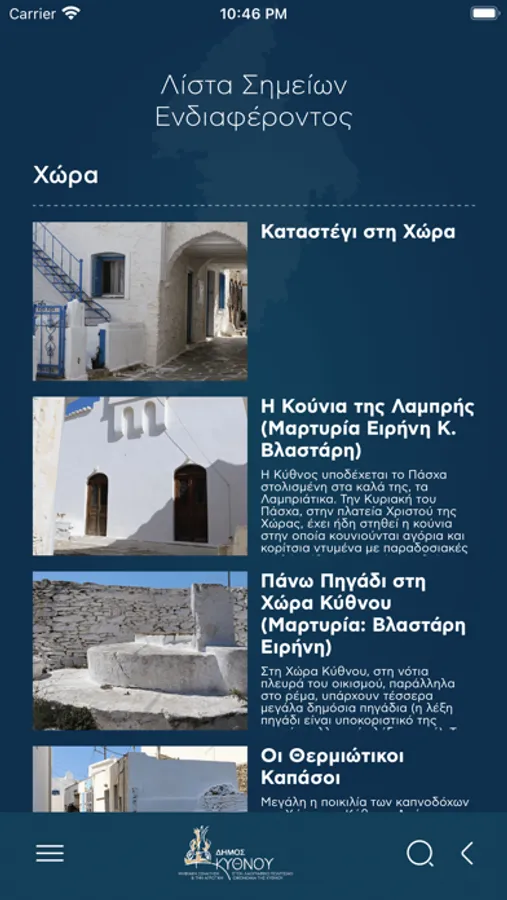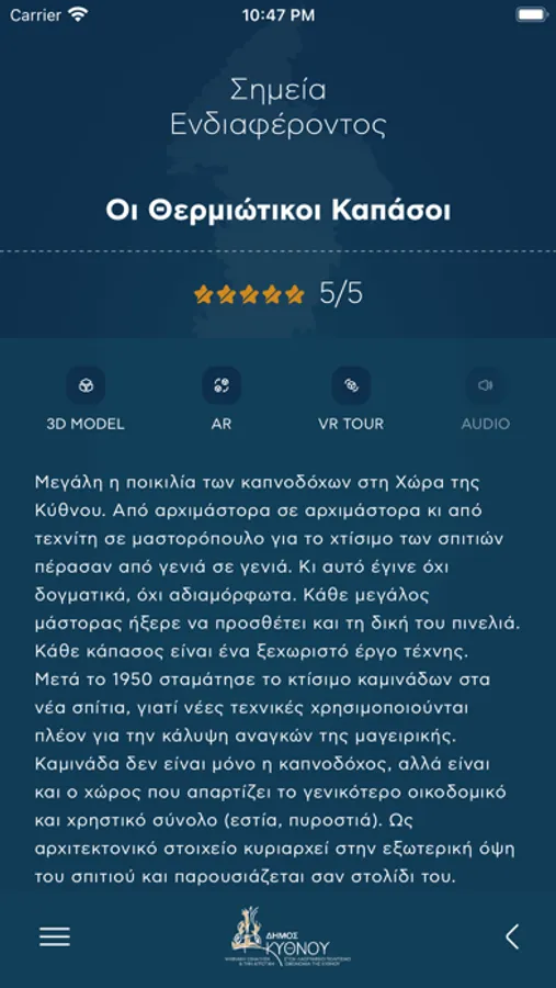 The application allows interactive digital tour through the utilization of modern tools of augmented reality, audio tour and modeling of selected points of interest of Kythnos.
