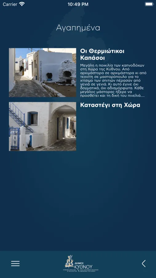 As part of the implementation of the project, a Mobile Application was developed, which includes the digital tour guide of the Folklore Culture and the Agricultural Economy of Kythnos in three languages (Greek, English, French).
