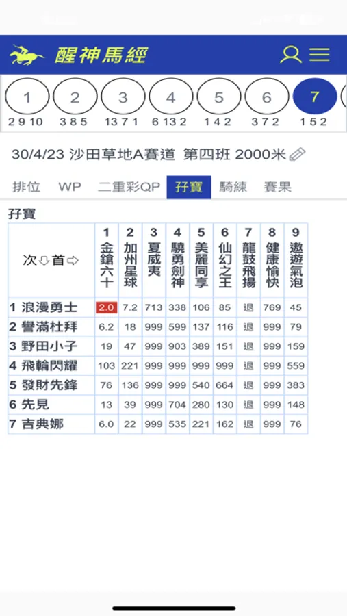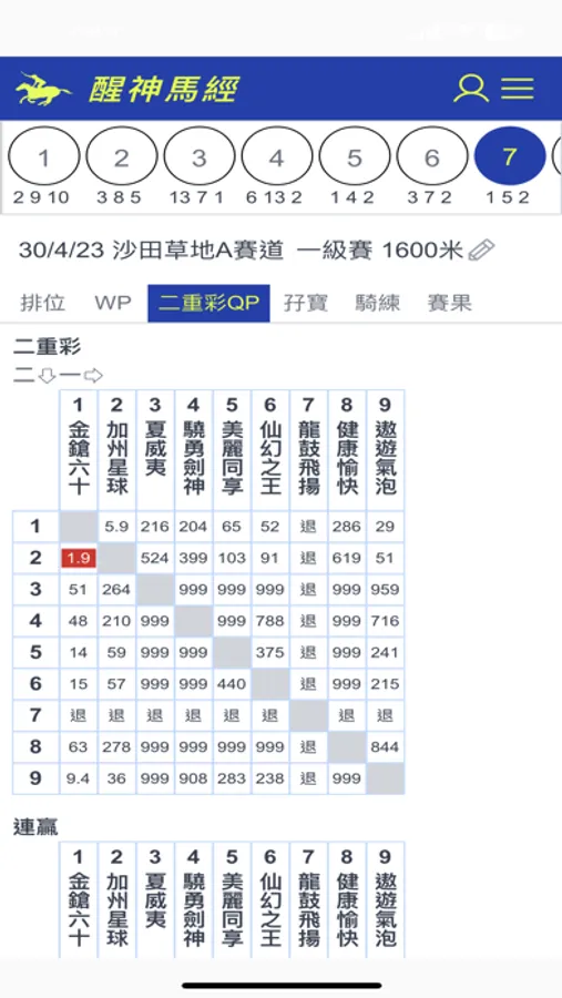 4. 賠率及走勢 - 提供最新的獨贏丶連贏、位置連贏、二重彩和孖寶賠率以及WP賠率走勢,並以黃格、綠格和啡格突出落飛注項,捕捉大戶信心票。
