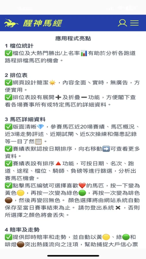 3. 馬匹詳細資料 - 版面清晰,參賽馬匹近20場往績、馬匹概況、近3場沿途走勢評述、近期試閘丶近5次晨操及傷患記錄等一應俱全;賽績表設有排序功能,可按日期、名次、跑道、途程、檔位、騎師、負磅等進行篩選,讓你分析各駒特點;點擊馬匹編號可自行以不同顏色燈標記心水馬匹。