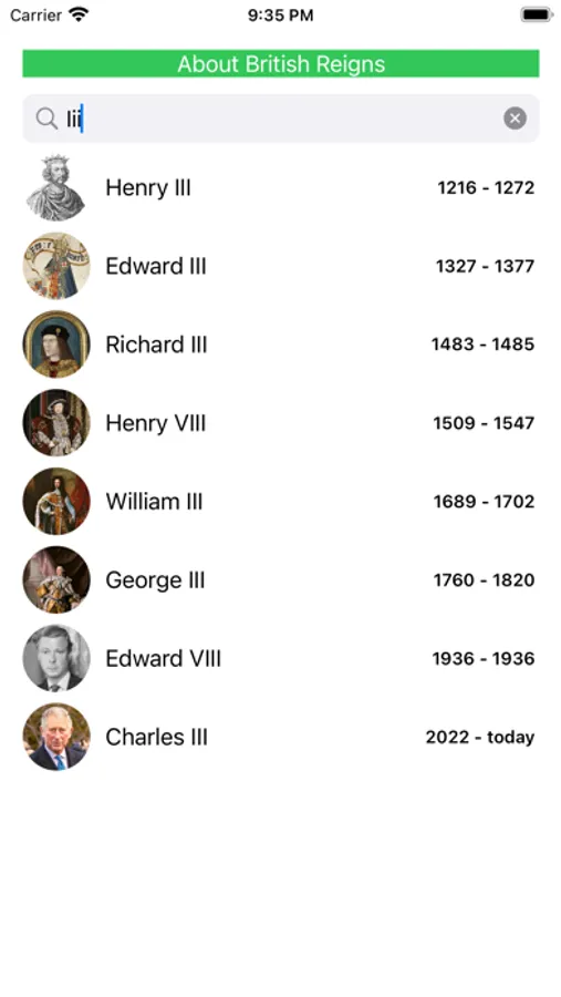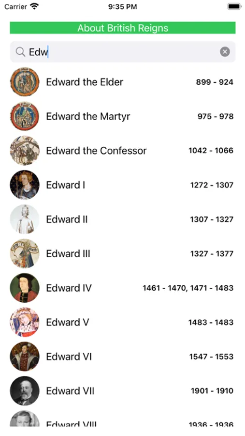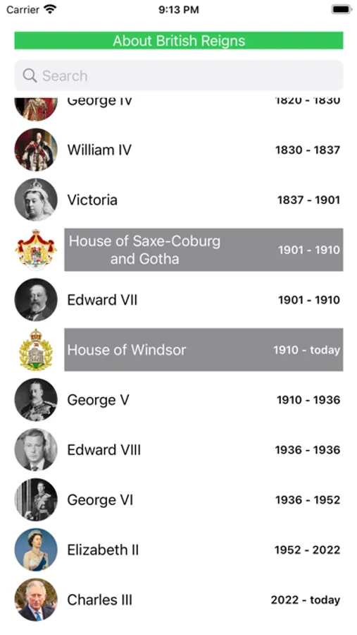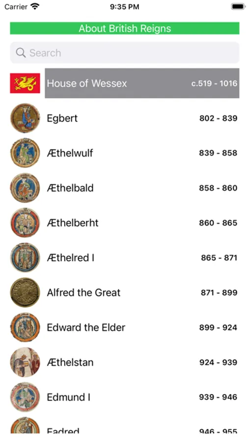 British Reigns is the ultimate app for anyone interested in British history. This app provides an overview of historical periods beginning with the Iron Age and a comprehensive list of all English & British monarchs with a wealth of information about their reigns, achievements, and struggles.