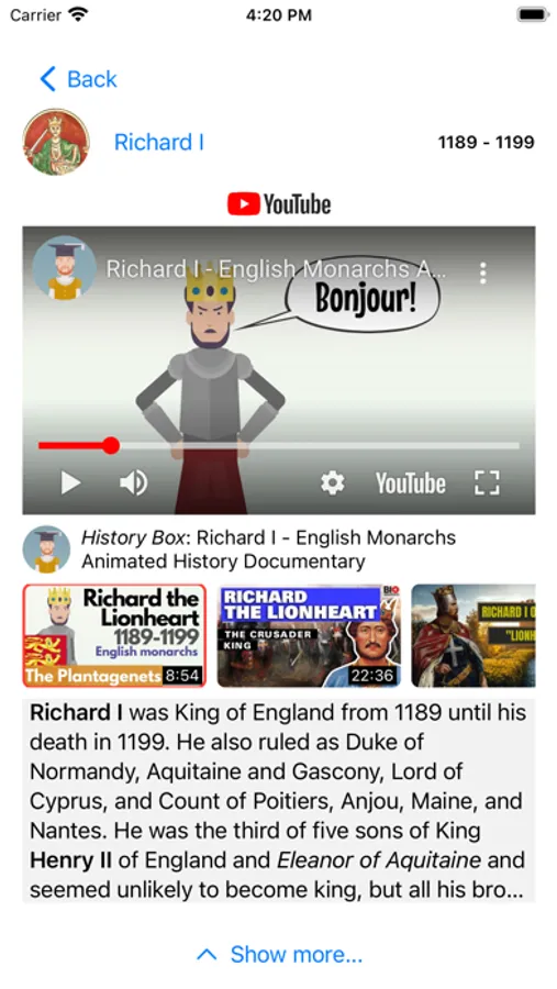 Each monarch comes with a short biography giving an overview of their life and rule. But the primary focus of the app is a collection of YouTube videos that delve deeper into the history of each monarch, providing fascinating insights into their times and the events that shaped their reigns. There are more than 250 videos: some short, some long, some dry, others - dramatic or entertaining.
