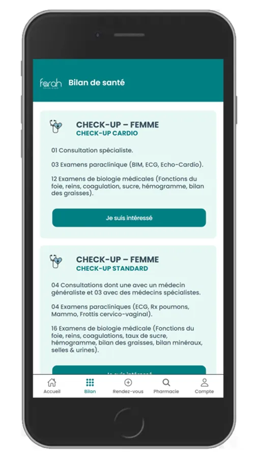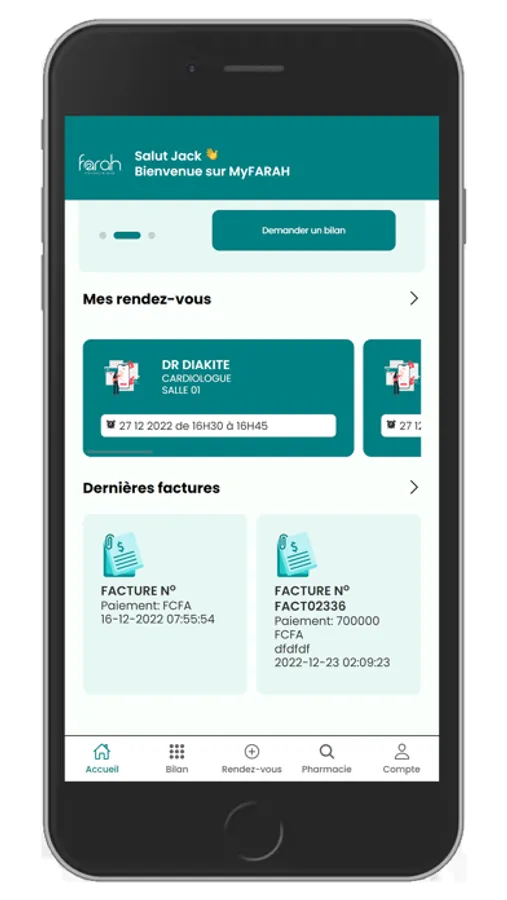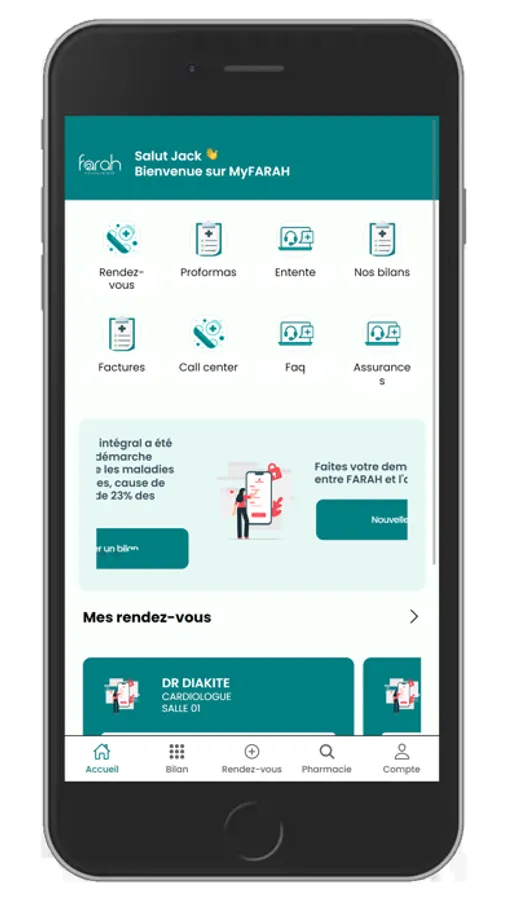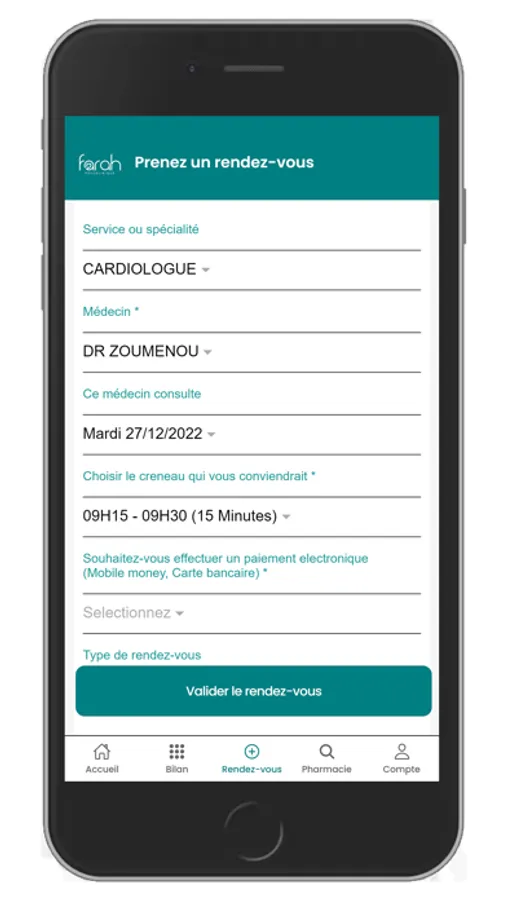 Elle vous permet de prendre des rendez-vous en ligne avec votre médecin. Suite à la prise de votre rendez-vous, vous pourrez régler votre facture à l'avance via mobile money ou VISA.