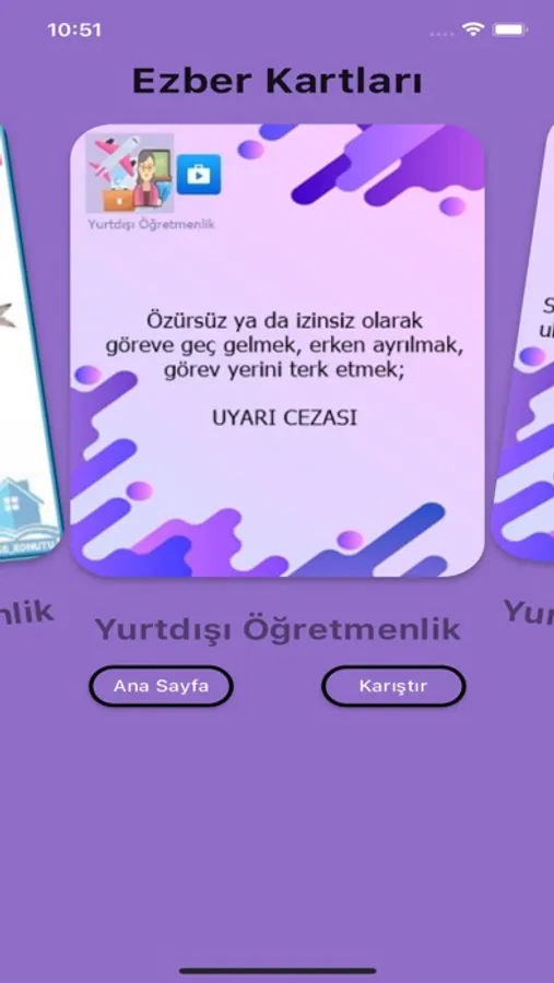 Mesleki Yeterlilik ve Temsil Yeteneği Sınavı için olmazsa olmaz bilgileri, özet bilgiler bölümü (Atatürk İlkeleri ve İnkılap Tarihi, Türk Tarihi ve Coğrafyası ile Vatandaşlık, Öğretim Yöntem ve Teknikleri, Milli Eğitim Temel Kanunu, 657 Sayılı DMK ile diğer Yasa ve yönetmelikler, Türk Dili ve Edebiyatı, Dil ve Anlam Bilgisi) ile hızlıca ve kolayca ezberleyebilirsiniz. Ayrıca Türkçe, Tarih, Genel Kültür, Güncel Bilgiler testleri de ayrı ayrı bulunmaktadır. Son olarak ezber kartları eklenmiştir. Ek olarak; Eşleştirme, Hafıza oyunları ve Adam asmaca oyunu tüm bu bilgileri pekiştirmenize yarayacaktır.