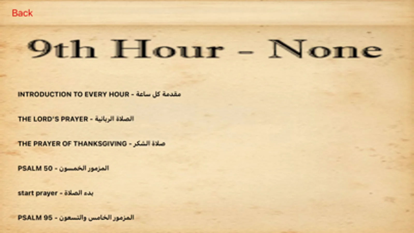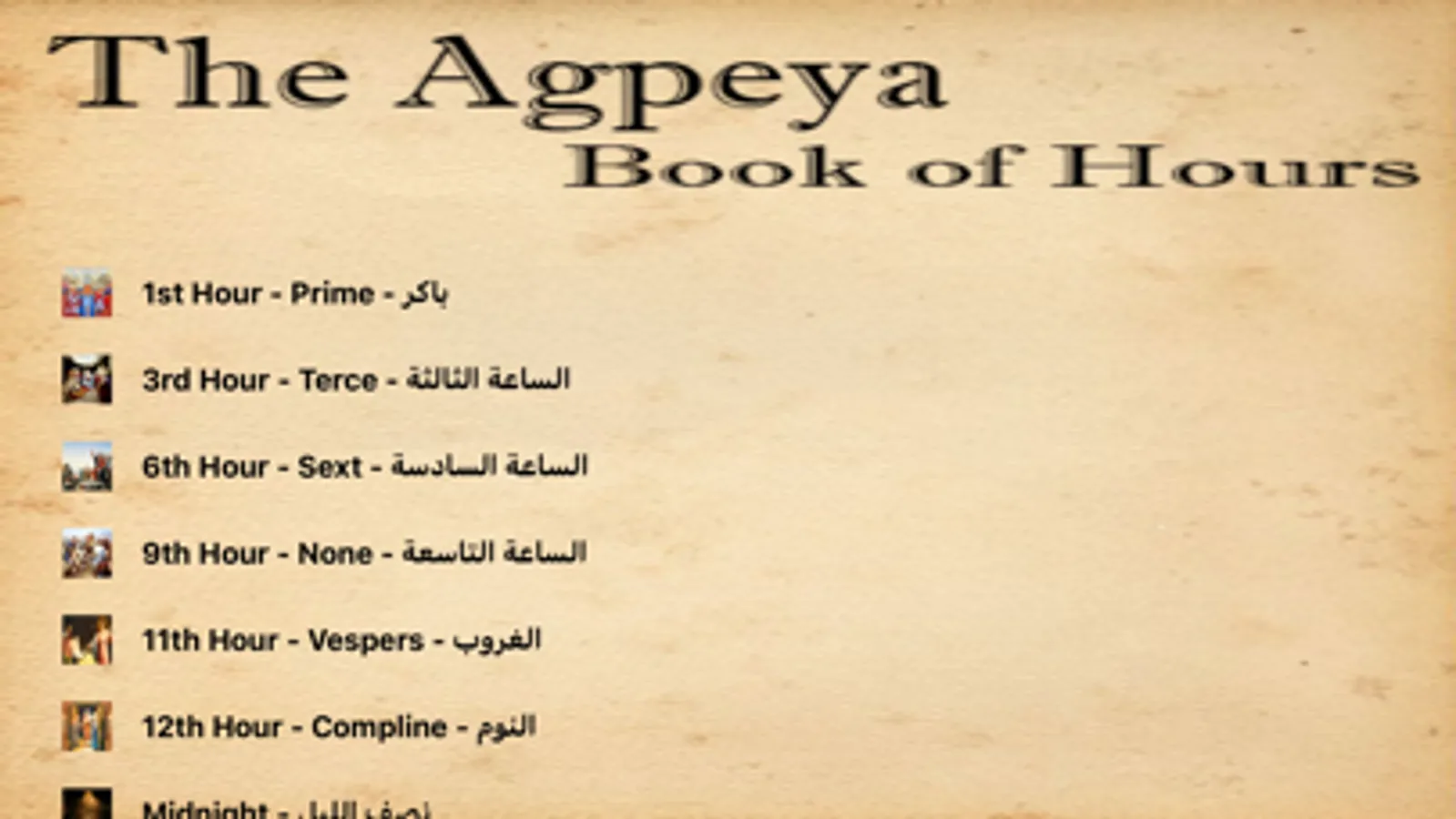 The Agpeya is primarily used by the Coptic Orthodox Church. It contains prayers for seven different hours to be said throughout the day. The hours are chronologically laid out, each containing a theme corresponding to events in the life of our Lord Jesus Christ.
