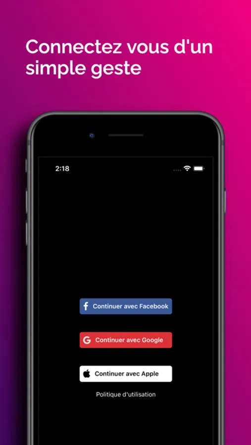 To connect to the mobile application, the user must continue using a social account (Apple, Google or Facebook).