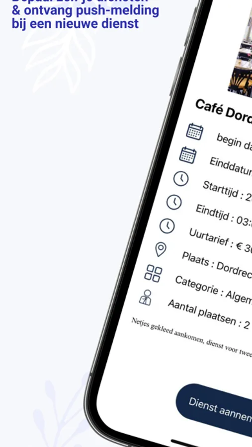 Speciaal ontworpen voor de PB Security medewerkers: de diensten-app. Ontvang pushmeldingen zodra er een nieuwe dienst beschikbaar is, bepaal zelf welke diensten je aanneemt en krijg uitgebreid informatie over je dienst.