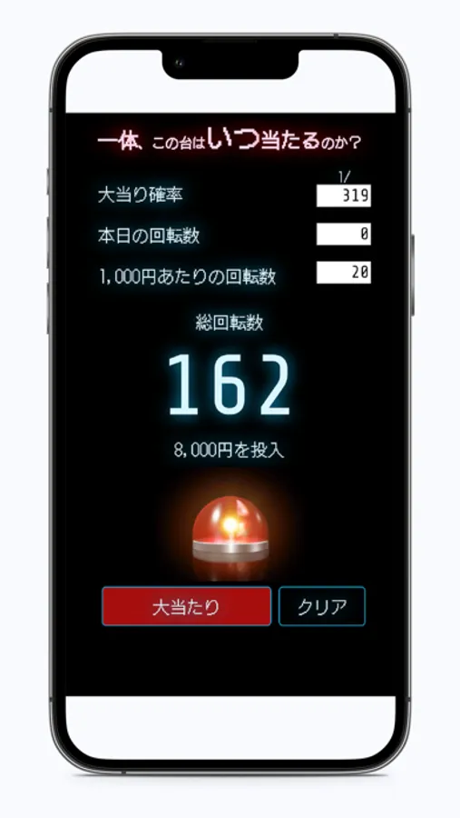 ・設定した確率によって、パチンコ(pachi)台を疑似的に回すことができます。また、1000円当たりの回転数を入力することで、そこまでに投入した金額もわかります。