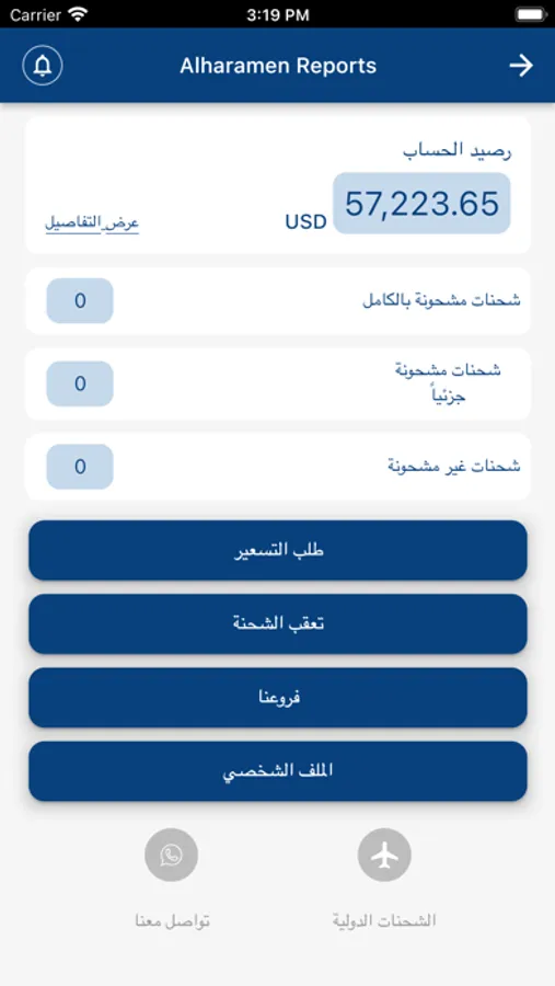 تطبيق تقارير برنامج شراع للشحن الدولي خاص بعملاء شركة الحرمين والسلطان للشحن الدولي
