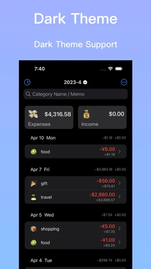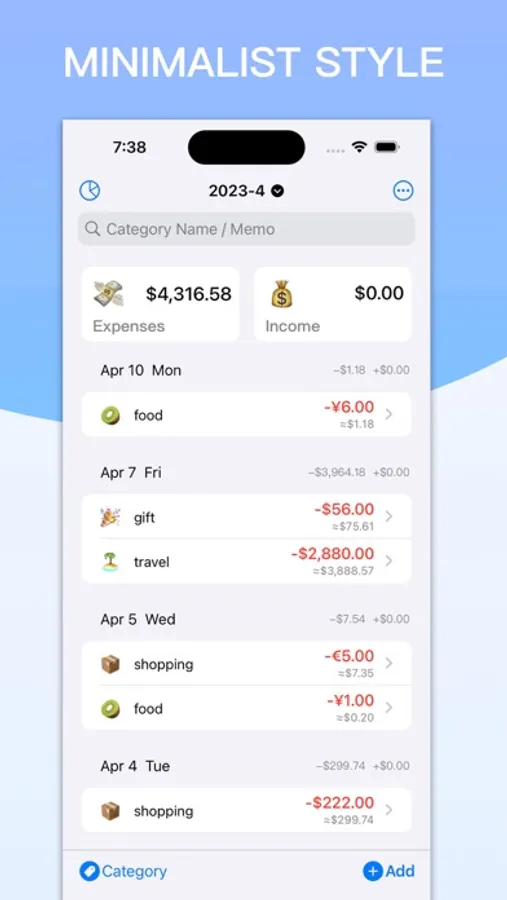 Unlike company bookkeeping and family bookkeeping, personal bookkeeping should be more private and simple. Your own data should be completely managed by yourself: you can save it locally and in the cloud if you like, and decide when to back up and restore it at any time, without worrying about data loss anxiety caused by problems with the server. Moneys stores all data locally on the mobile phone, Your data is only yours.