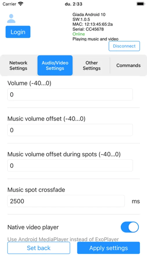 - Media settings: Set volume, screen rotation, resolution, music crossfade duration.