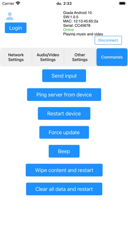 - Send commands to the device: Restart, Ping server (to check network connection), Force update, Beep, Send input (to play specific sound messages, for example), Wipe content and restart.