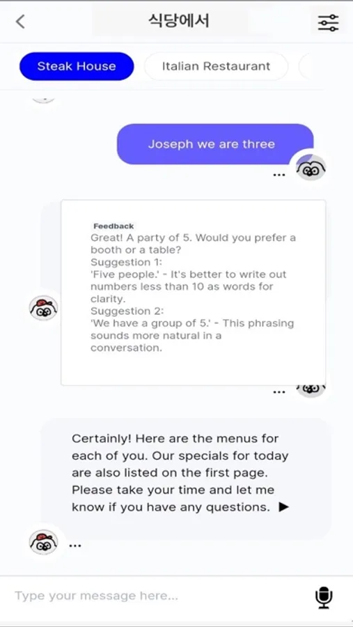 Through AI conversation simulations in various situations such as restaurants, meetings, and banks, you can engage in natural English conversations. When you're unsure of how to respond, you can check recommended answers and continue learning. This service is perfect for those who want to improve their English conversational skills in practical situations.