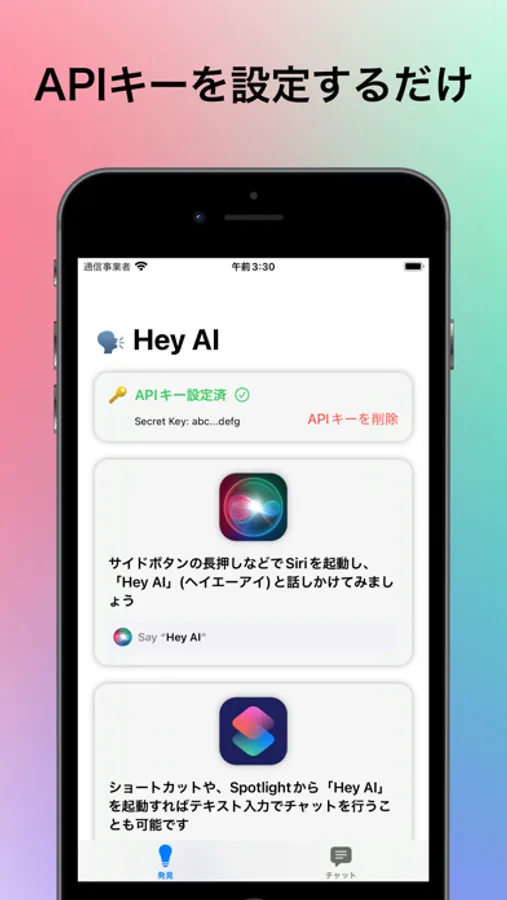 アプリ内でのチャット機能だけでなく、Siriおよびショートカットにも標準対応しており、アプリをインストールするだけで利用可能です。
