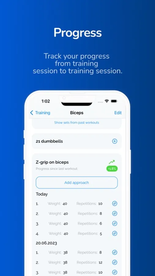 Plan each exercise and record the weights, repetitions and sets. Use the analytics to track your progress - see your progress in green with a + sign.