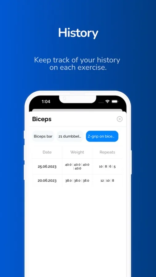 Plan your workouts using the calendar, record your results, make changes. Click on a specific date to view your personal workout plan with detailed information: which muscle group to exercise, number of sets and reps, and weight.