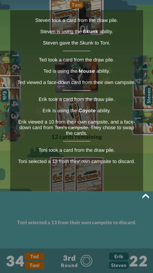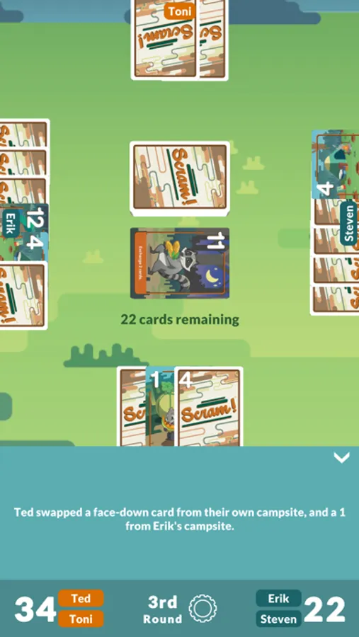 After hiking a local trail, you and your partner have returned to a campsite completely ransacked by pesky critters. Team up to clear your campground of critters before your neighbors. Scram! is a fun & fast game to play against an AI or online against your friends!