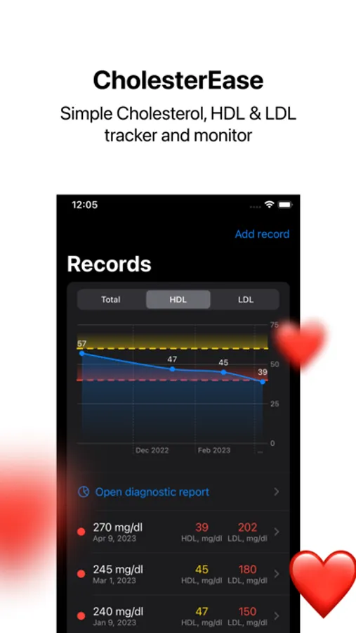 Take control of your heart health and make informed decisions with CholesterEase. Our user-friendly cholesterol tracking app is designed to help you stay on top of your HDL and LDL levels, giving you the tools and insights needed to maintain a healthy lifestyle.