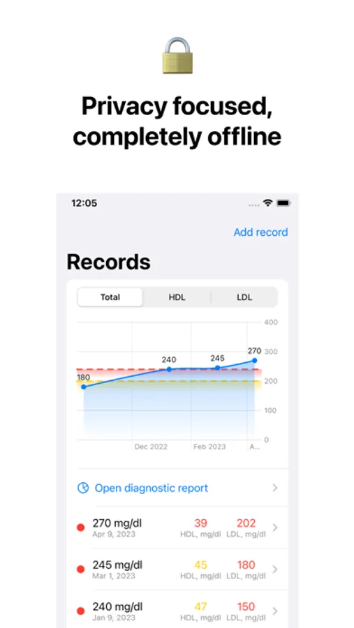 Introducing CholesterEase, the ultimate cholesterol management tool designed to help you monitor your HDL, LDL, and total cholesterol levels, calculate risk factors, and provide personalized recommendations for a healthier lifestyle. Keep track of your heart health with our easy-to-use, offline app that renders dynamic charts and visualizes your progress over time.