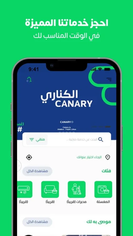 الكناري أول تطبيق في ليبيا للخدمات النظافة والغسيل، يلبي جميع احتياجات العملاء، يوفر منصة الكناري كافة احتياجاتك سواء خدمات الغسيل أو النظافة عند باب منزلك، منصة الكناري هو الحل الأمثل والآمن عن طريق اختيار الخدمة التي تريدها وتحديد المكان والوقت وسنقوم بإيصالك بمزوّد الخدمة المناسب أو عن طريق تصفح قائمة مقدمي الخدمات لبعض الأقسام والخدمات بالتطبيق..