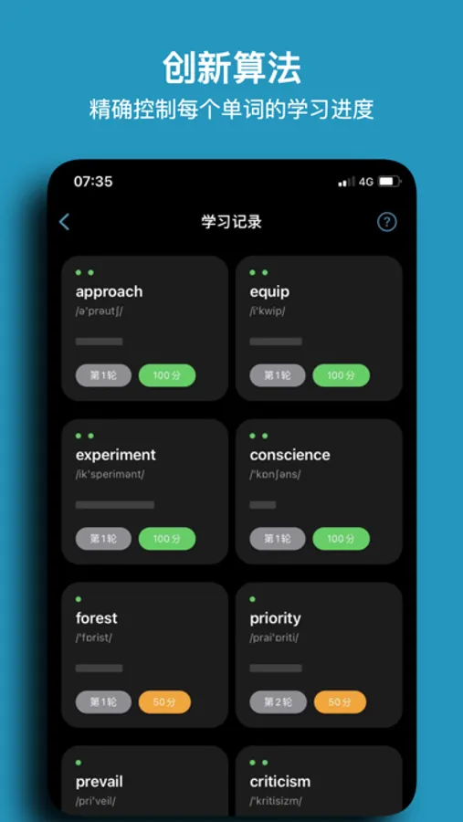 创新的算法配合遗忘曲线管理每个单词的复习周期,精确到秒。