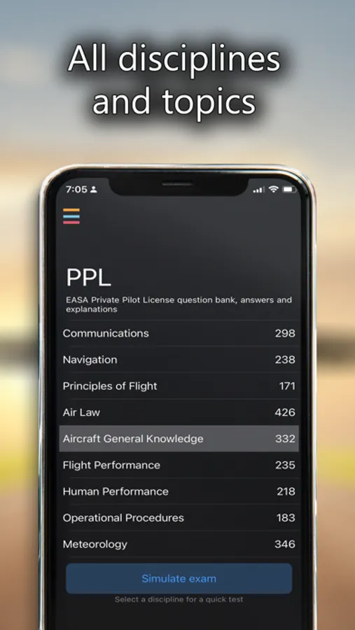 The PPL exams & tests application helps you prepare for your private pilot licence theoretical exams across all 9 disciplines: